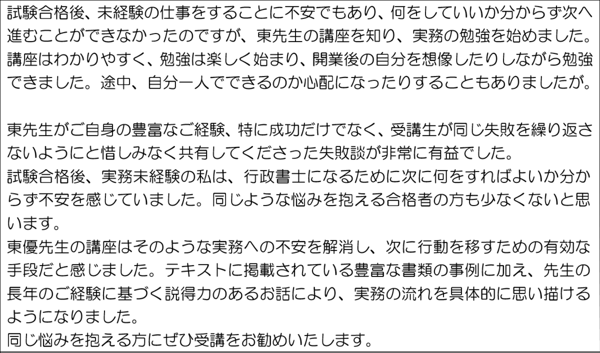 私は開業以来、相続・遺言業務に携わる中で様々なセミナーや研修を受講してきましたが、東先生の「相続実務研修講座」ほど、実務に直結する講座はありませんでした。