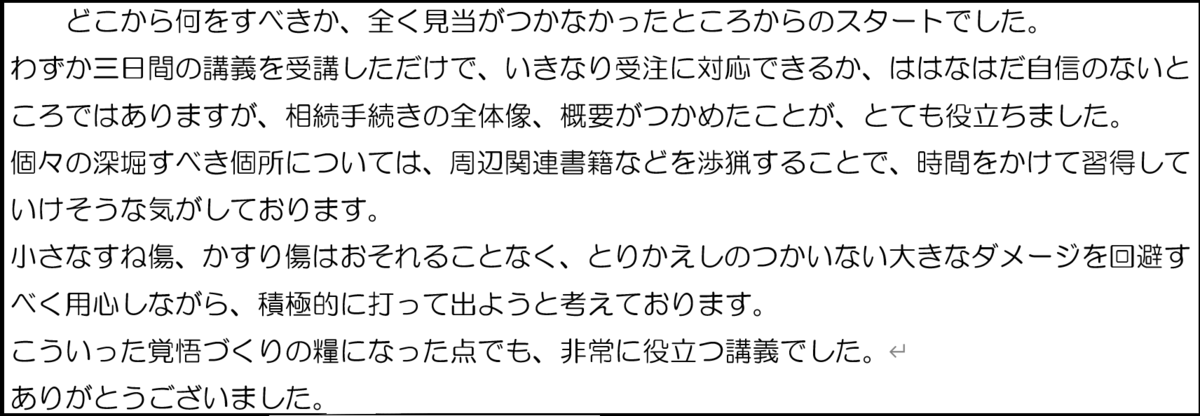 申込時は、連休を3日間つぶすスケジュールや費用面などから、効果や内容に一抹の不安もありましたが、実際に受講してみると、基本知識の説明のみならず、実体験を基にした必要書類や作成方法、関連する実務情報の細部にわたる提供など、実務主体の変化ある講座内容が続いたため、瞬く間に最終日を迎え、ロングランの割には疲労感もなく、相続・遺贈の全体把握ができました。